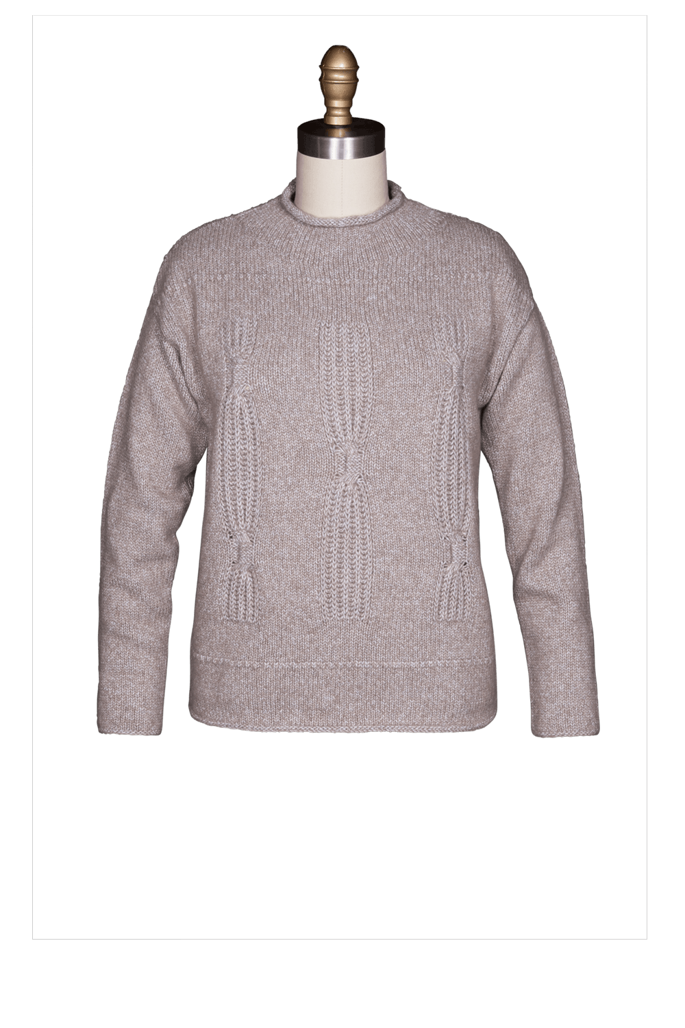 • L/S rolled loose turtleneck with drop shoulder. Beautiful popcorn stitch detailed yoke with pinched cable design front and back.