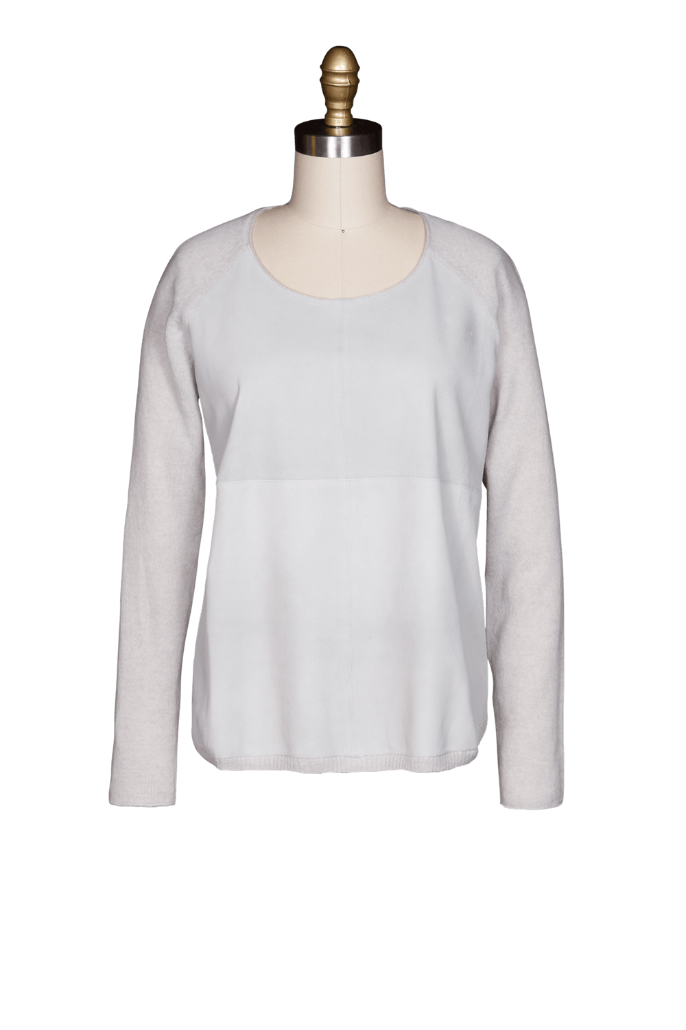 L/S Scoop neck sweater with washable suede front and knit back. Great layering piece with texture.