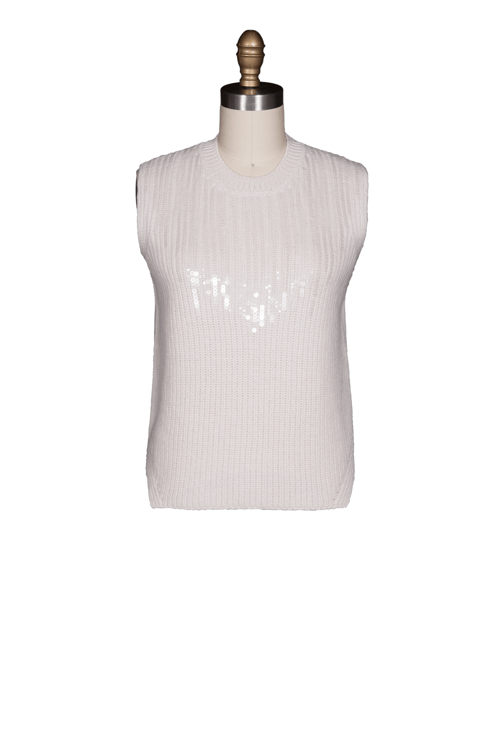 • Modern classic pullover vest in a merino/cashmere blend. Beautifully cable stitch with clear sequins knitted into the front yoke. Perfect for layering under your down jacket or blazer.