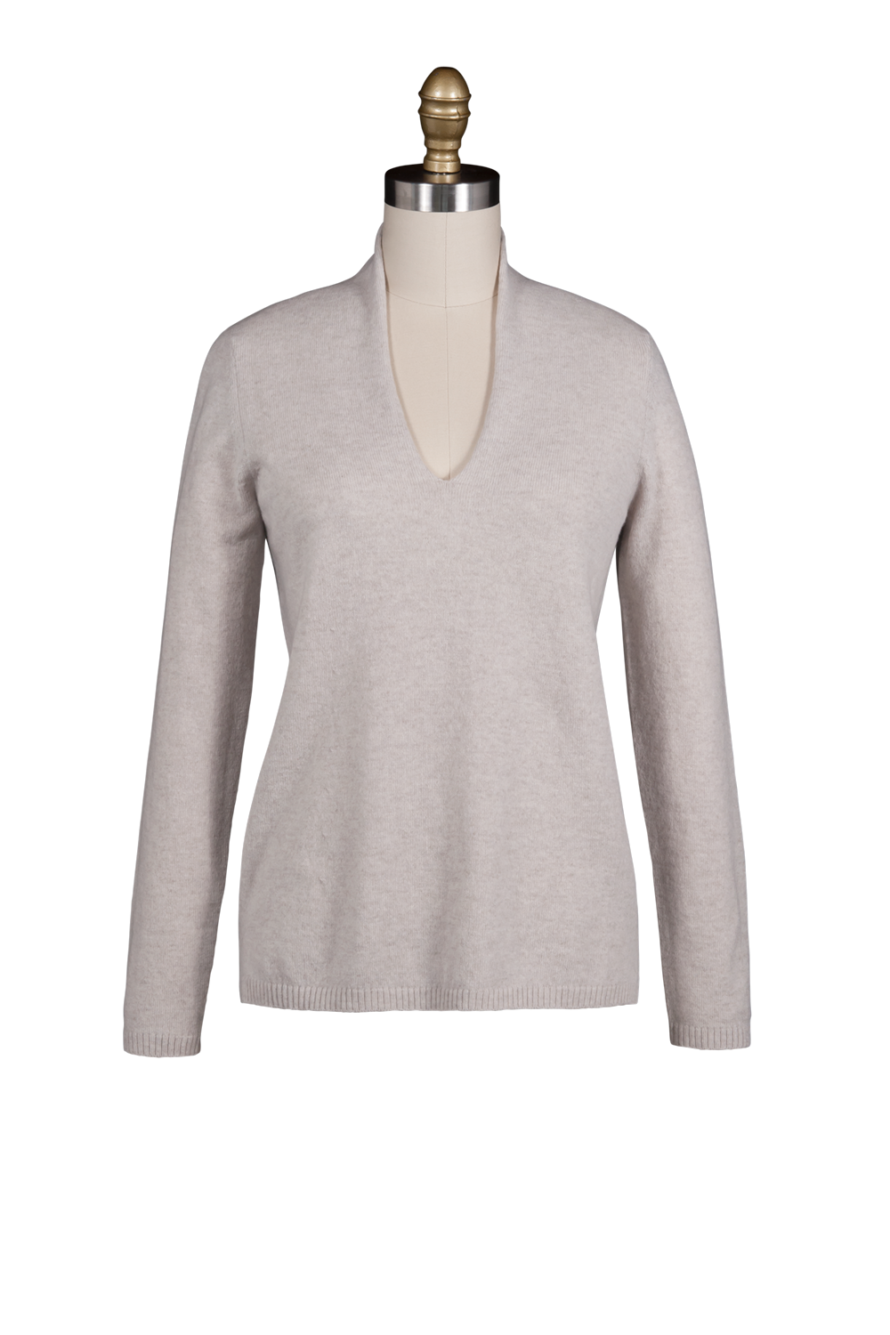 • Long sleeve rolled V neck pullover. Slightly fitted body