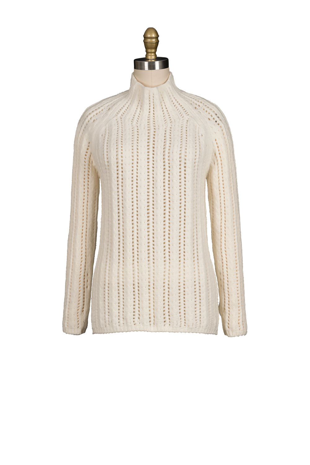 • L/S Peek-a-boo open knit T-neck. Detailed in virgin wool accented with a high-low hem.