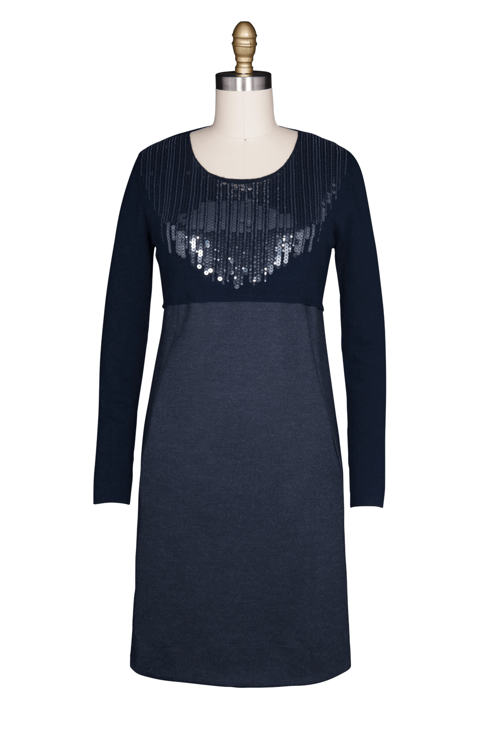 - Empire style dress with knit cashmere top blended with Wool knit jersey fabric. Beautifully detailed with clear sequins cascading the front yoke. A great dress to go from office to evening.